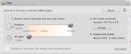 Het F.Lux software programma is een uitkomst voor de beeldschermplakkers die op een dag bovengemiddeld lang naar een beeldscherm turen. Overdag is dat witte en blauwe licht geen probleem, maar in de avonduren kan het nadelige effecten op een mens hebben. Slaapproblemen, verblinding, hoofdpijn, etc. F.lux past automatisch de kleurtemperatuur en helderheid aan. Van prikkelend blauw naar een zacht rode gloed. Dan kan in 20 seconden, of haast ongemerkt over een periode van een paar uren.